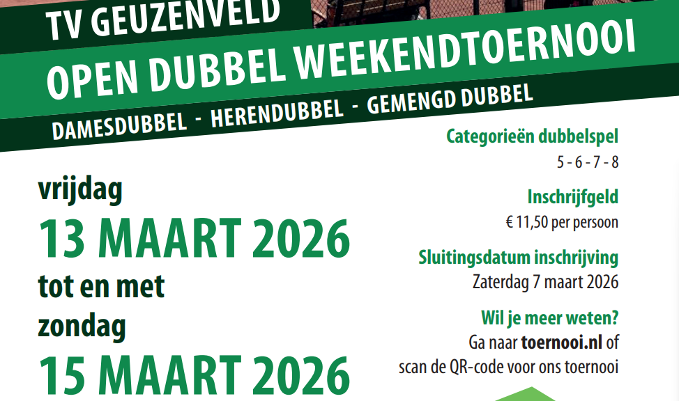 Om dat seizoen knallend te openen én je optimaal voor te bereiden op de voorjaarscompetitie, hebben we iets leuks voor je in petto: het Geuzenveld Open Dubbel Weekendtoernooi.